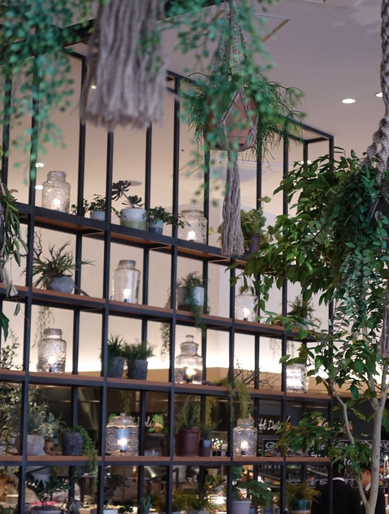 緩やかなゾーニングをグリッドのディスプレイ棚と腰高の大きなベンチシートで表現し、奥まって光が届かないスペースは敢えてトーンを抑えることで、表のグリーンのスペースとの対比された落ち着いたダイニング空間とした。